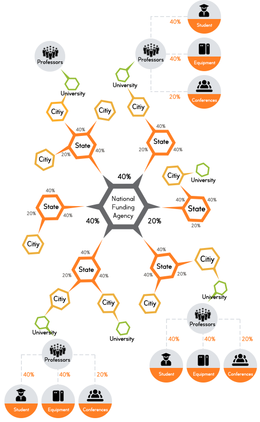 National Funding Agency allocates $1 billion vaccine research grants, distributed to 26 states, which then to 70 cities, then to 200 universities, and then to 450 professors, requiring 40% used for equipment purchases, 40% for student support, and 20% for conferences (lodging, transportation, and registration).